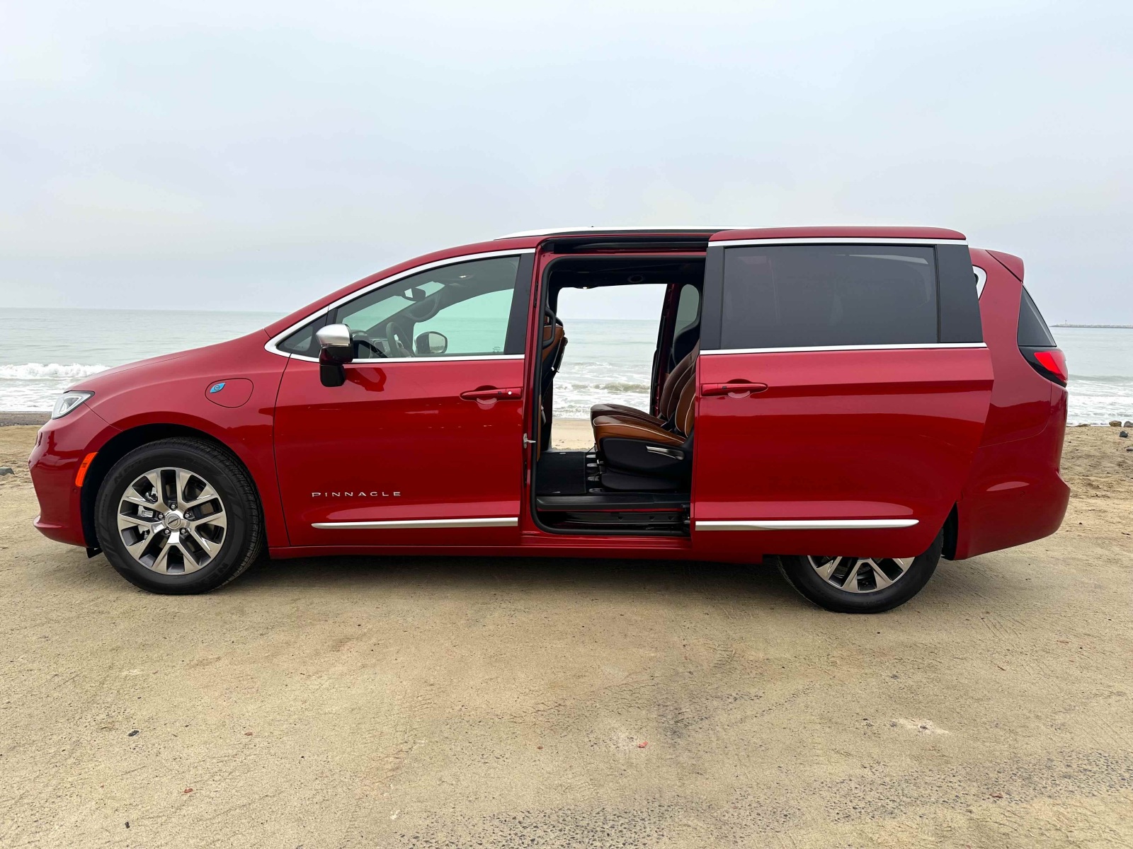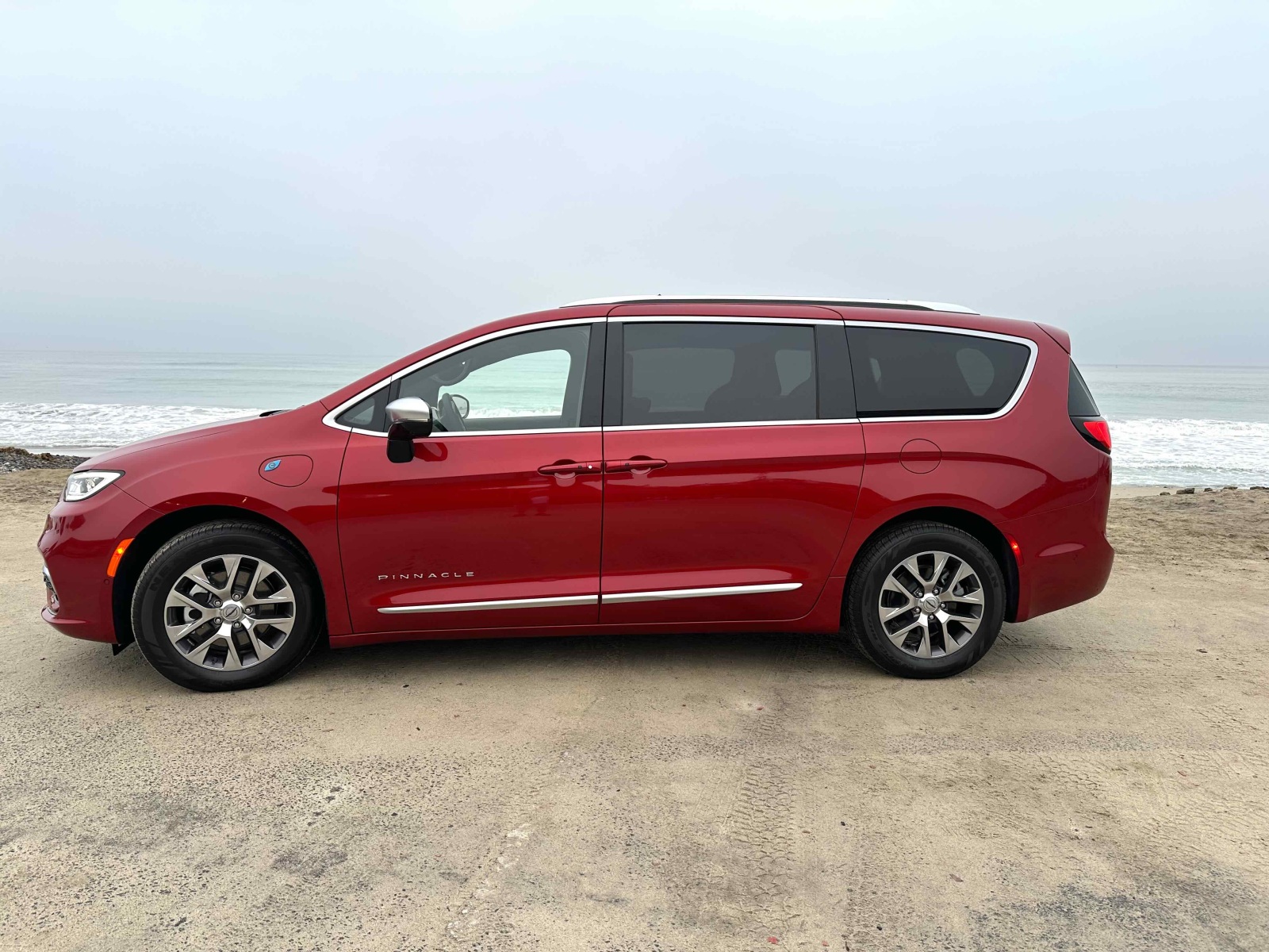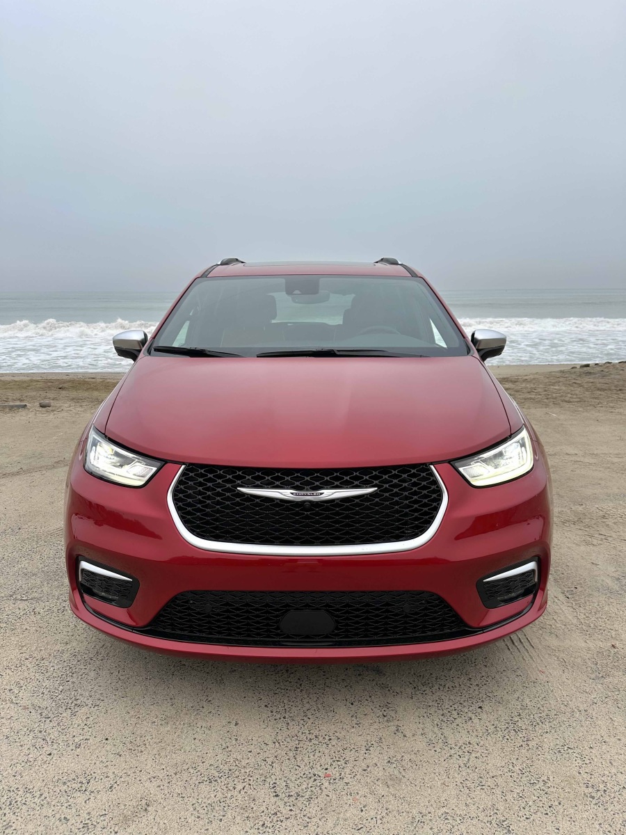 The Pacifica PHEV, redesigned for 2021, comes in two trim levels—Select and Pinnacle, the latter of which Clean Fleet Report drove. The design has a wide, low stance (5.1-inches of ground clearance), cutting a sleek silhouette (as much as a minivan can) and looked sharp painted in Red Hot Pearl ($495 option), which is one of five exterior colors.