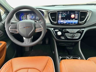 The interior on our Pacifica Pinnacle PHEV was done-up with a classy Black and Sepia combination. The suede headliner was a nice touch as is the white top stitching and piping on the Nappa leather seats and doors. The quilted front seats were heated and ventilated, with 8-way power adjustments including lumbar. The driver seat comfort was aided by the tilt and telescoping steering column. The heated leather-covered multi-function steering wheel had cruise, radio, telephone controls.