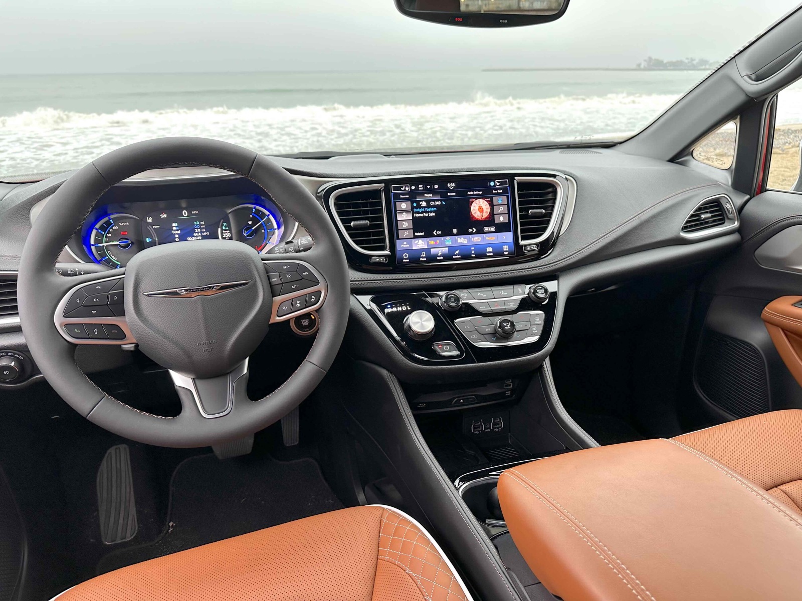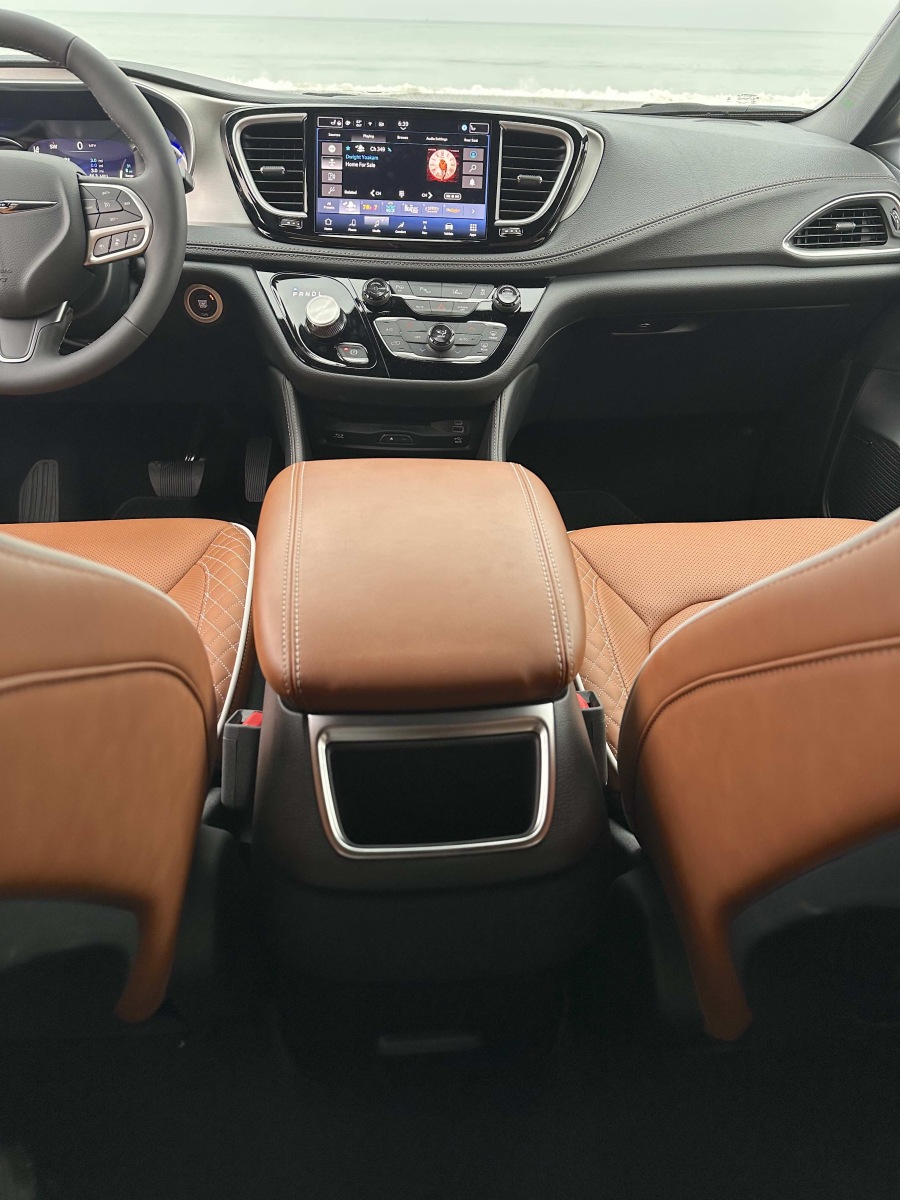 The interior on our Pacifica Pinnacle PHEV was done-up with a classy Black and Sepia combination. The suede headliner was a nice touch as is the white top stitching and piping on the Nappa leather seats and doors. The quilted front seats were heated and ventilated, with 8-way power adjustments including lumbar. The driver seat comfort was aided by the tilt and telescoping steering column. The heated leather-covered multi-function steering wheel had cruise, radio, telephone controls.