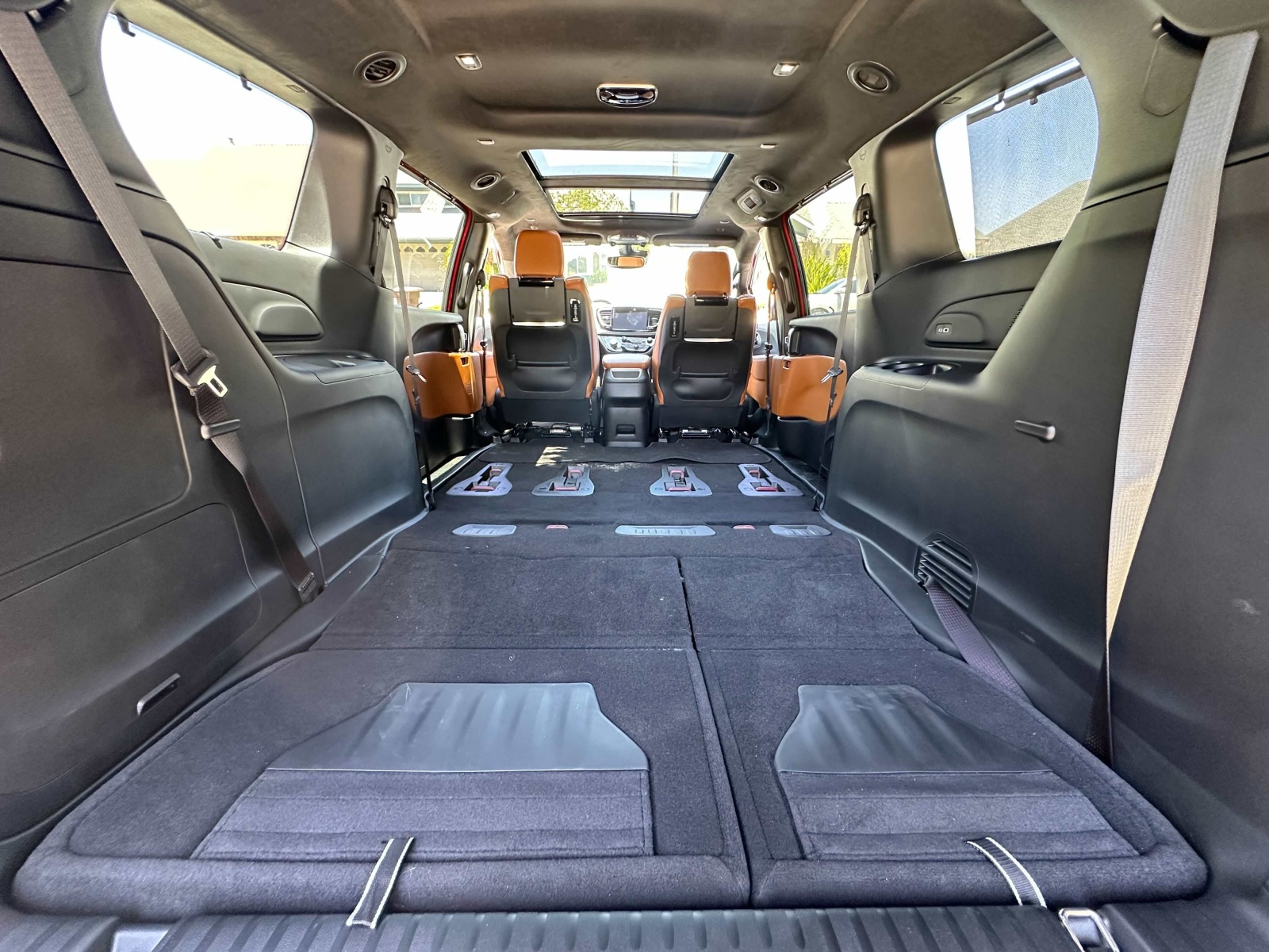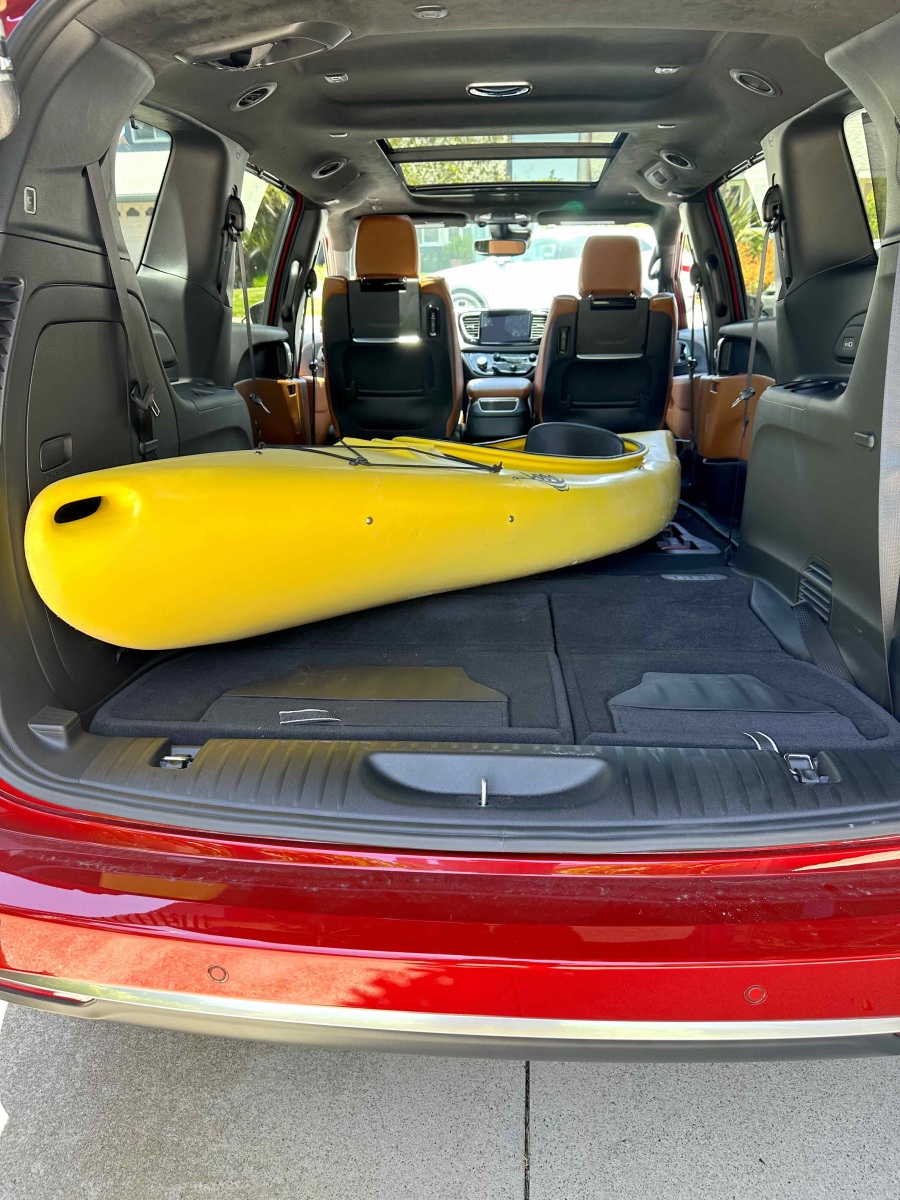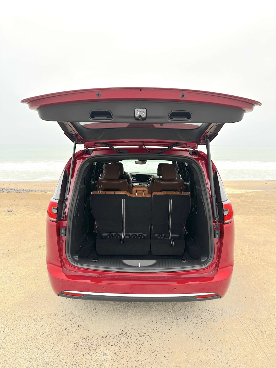 Access to the second and third rows is easy through the hands-free side sliding doors. The second-row Captain’s Chairs tilt forward, slide, recline and, while heavy, are easily removable. Slid to the forward position, the second-row seat opens the path to the third row. Once back there, three adults can fit (two in comfort), with even a 6-footer’s head not scraping the ceiling. Knee and leg room for third-row passengers was good and puts all but the largest SUVs to shame.