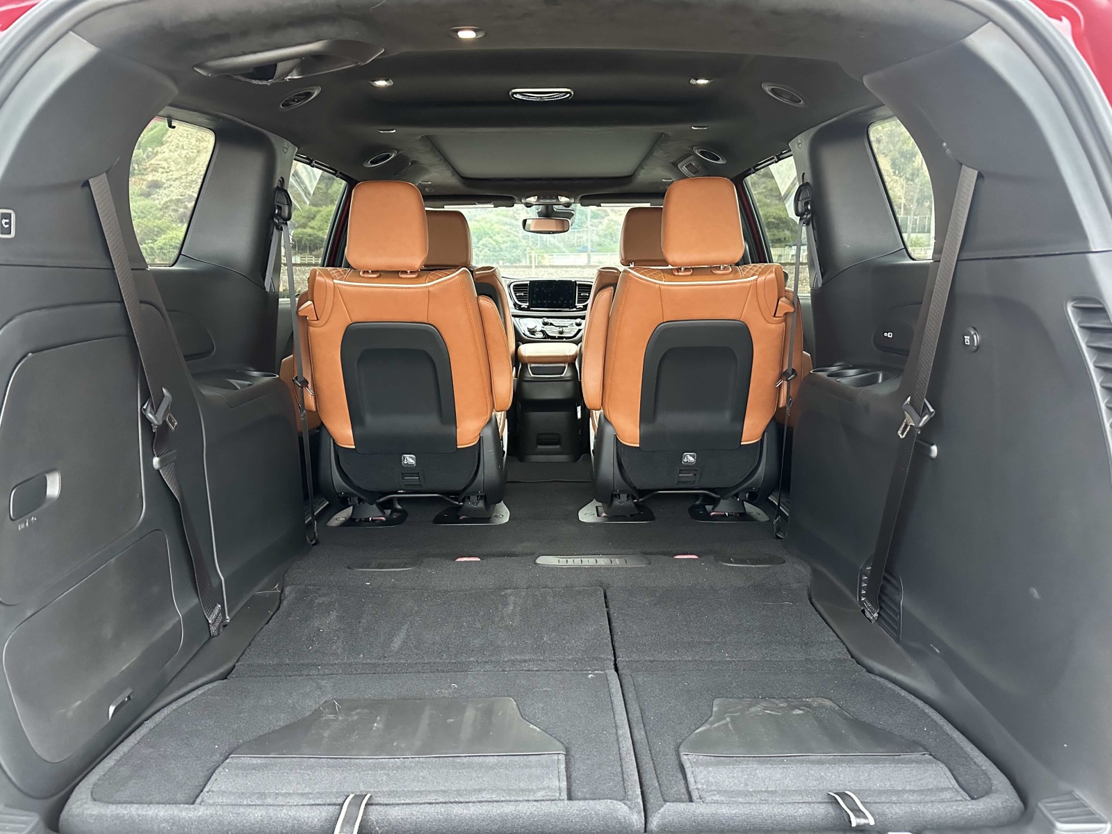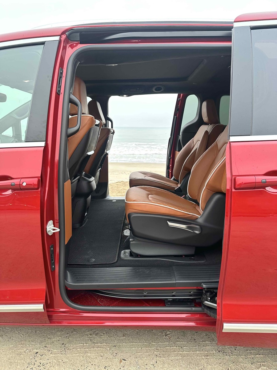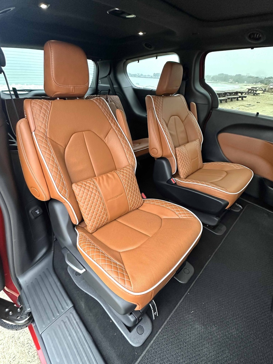 Access to the second and third rows is easy through the hands-free side sliding doors. The second-row Captain’s Chairs tilt forward, slide, recline and, while heavy, are easily removable. Slid to the forward position, the second-row seat opens the path to the third row. Once back there, three adults can fit (two in comfort), with even a 6-footer’s head not scraping the ceiling. Knee and leg room for third-row passengers was good and puts all but the largest SUVs to shame.