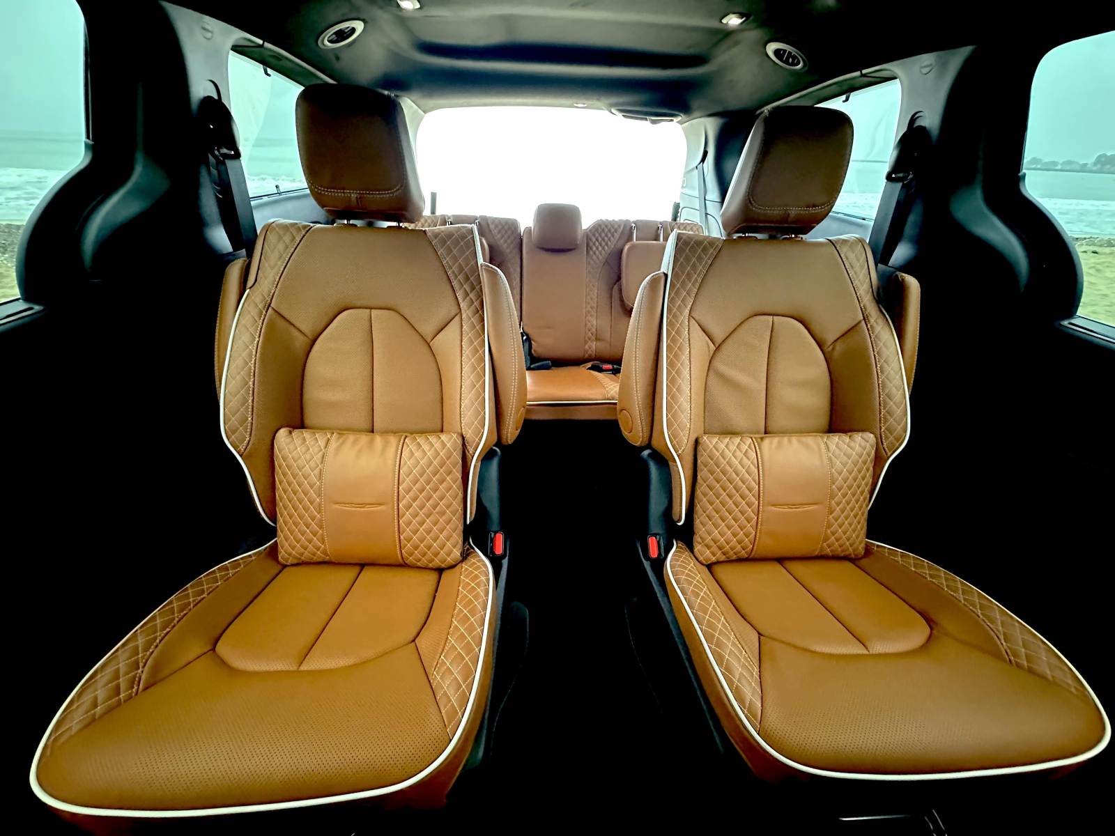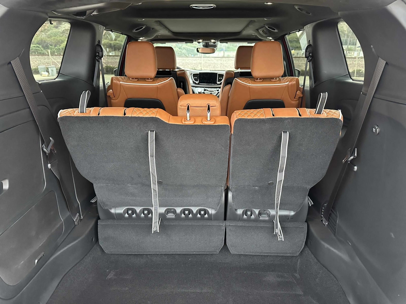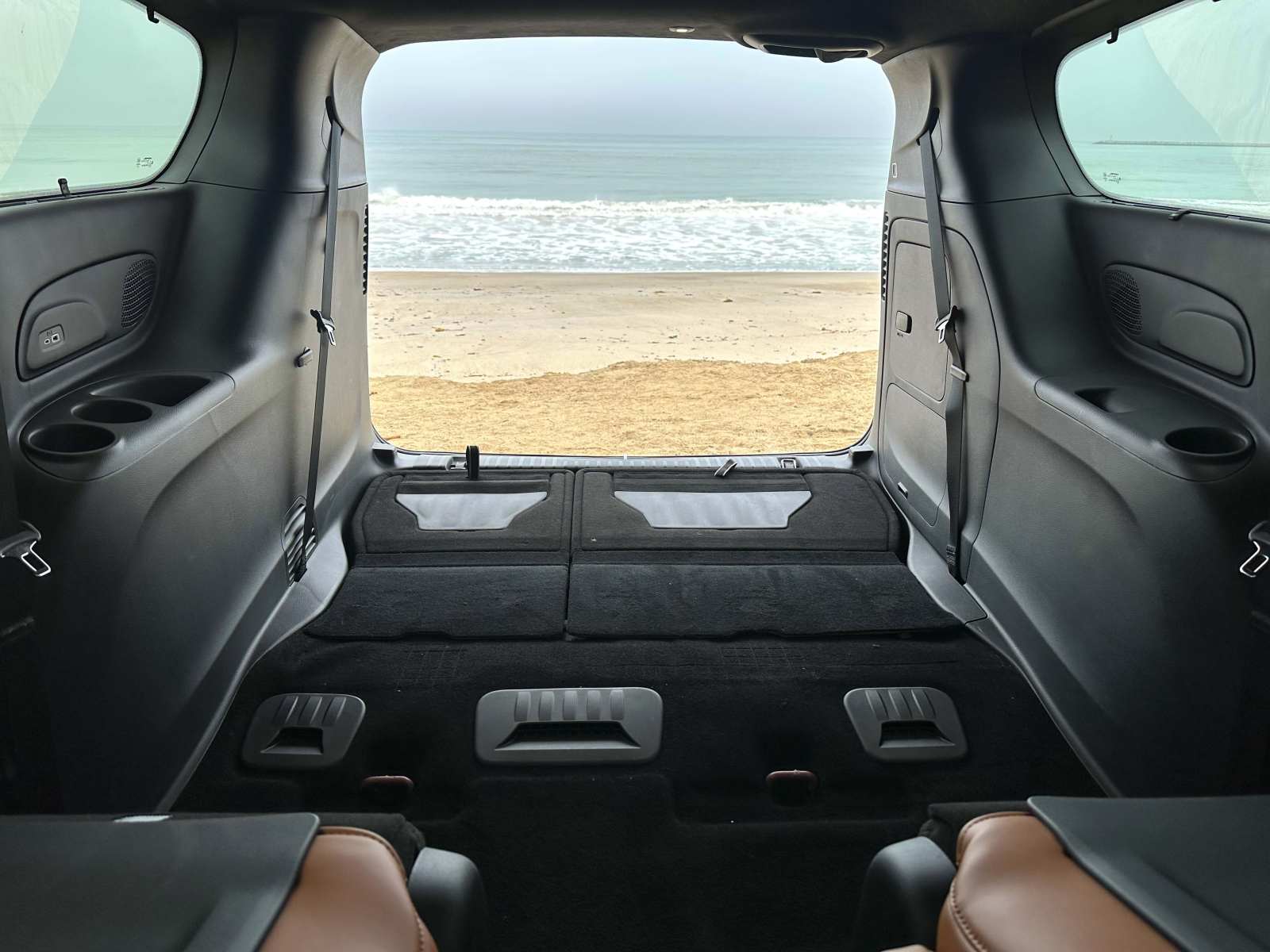 Access to the second and third rows is easy through the hands-free side sliding doors. The second-row Captain’s Chairs tilt forward, slide, recline and, while heavy, are easily removable. Slid to the forward position, the second-row seat opens the path to the third row. Once back there, three adults can fit (two in comfort), with even a 6-footer’s head not scraping the ceiling. Knee and leg room for third-row passengers was good and puts all but the largest SUVs to shame.
