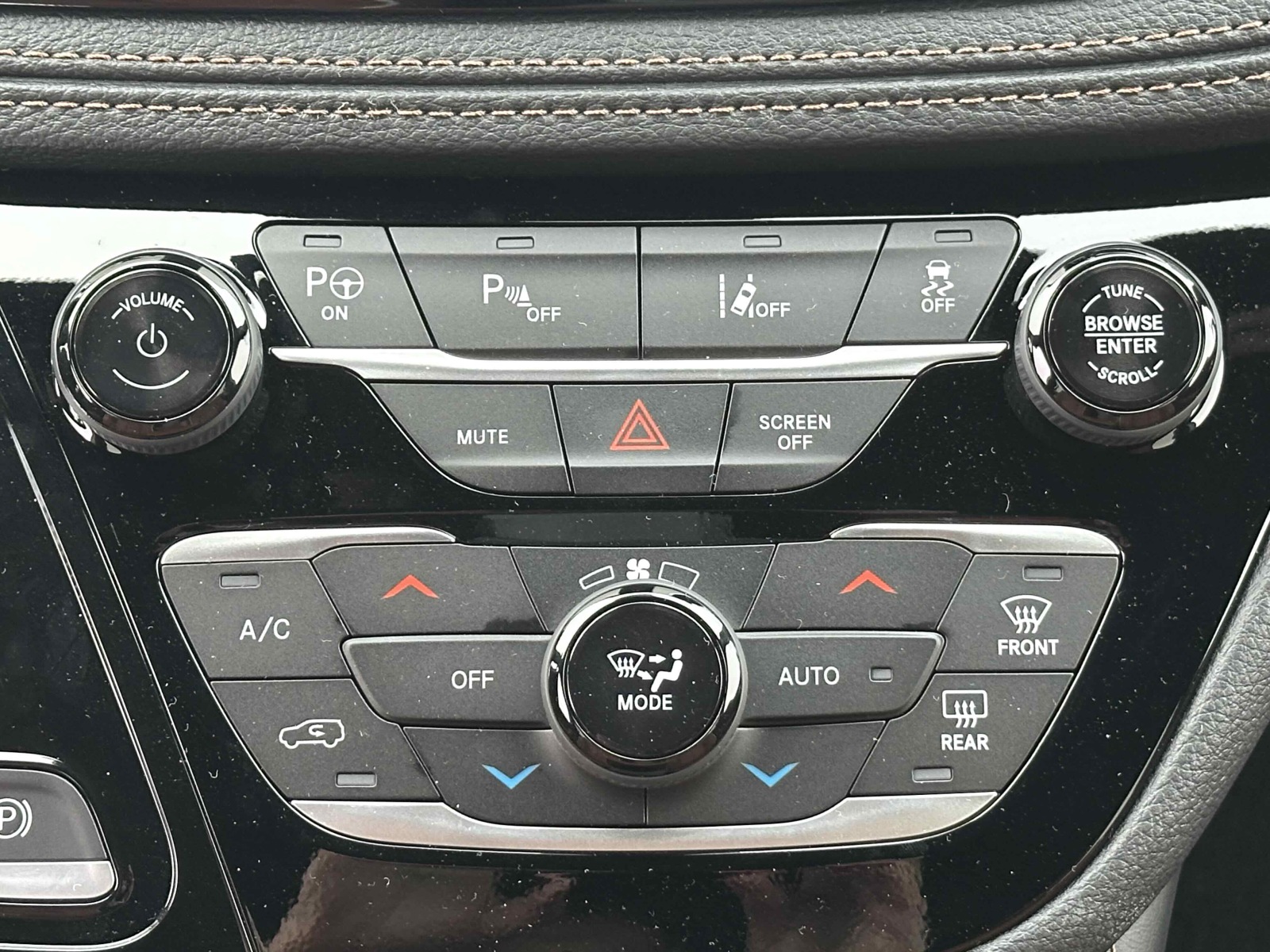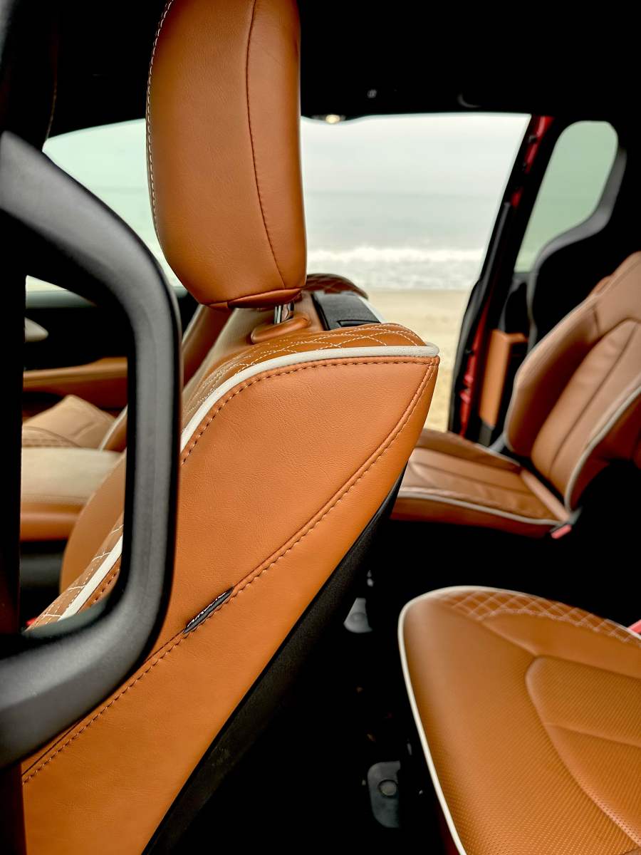 The interior on our Pacifica Pinnacle PHEV was done-up with a classy Black and Sepia combination. The suede headliner was a nice touch as is the white top stitching and piping on the Nappa leather seats and doors. The quilted front seats were heated and ventilated, with 8-way power adjustments including lumbar. The driver seat comfort was aided by the tilt and telescoping steering column. The heated leather-covered multi-function steering wheel had cruise, radio, telephone controls.