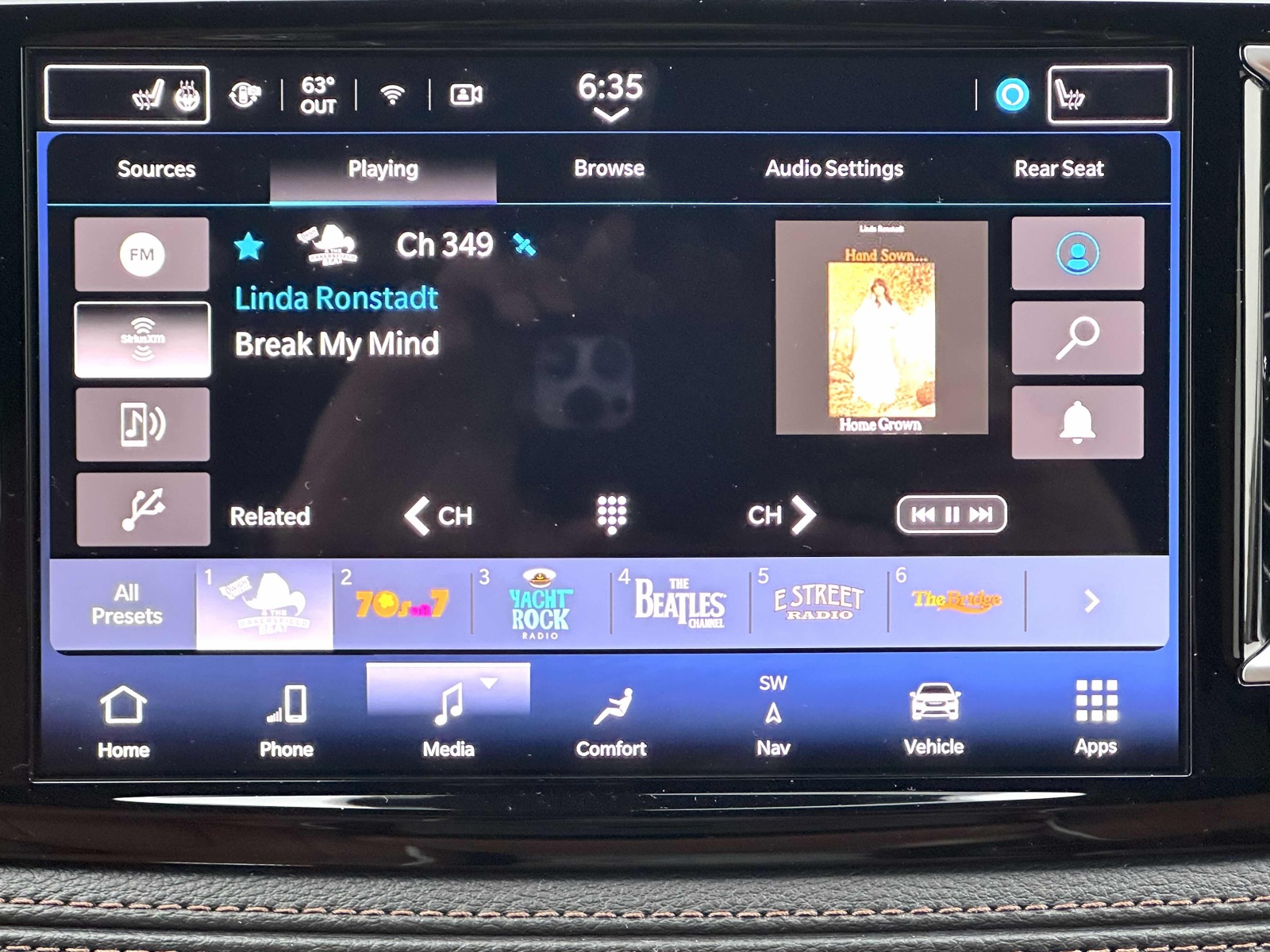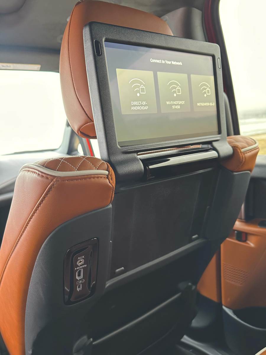 Second-row passengers get individual, multimedia 10-inch horizontal, high-definition seat back video screens with HDMI ports. The three-channel, wireless headphones and Bluetooth touchpad remote controls make for an uncluttered entertainment experience. There is also a ceiling mounted digital display to control the heat, vents and air conditioning.