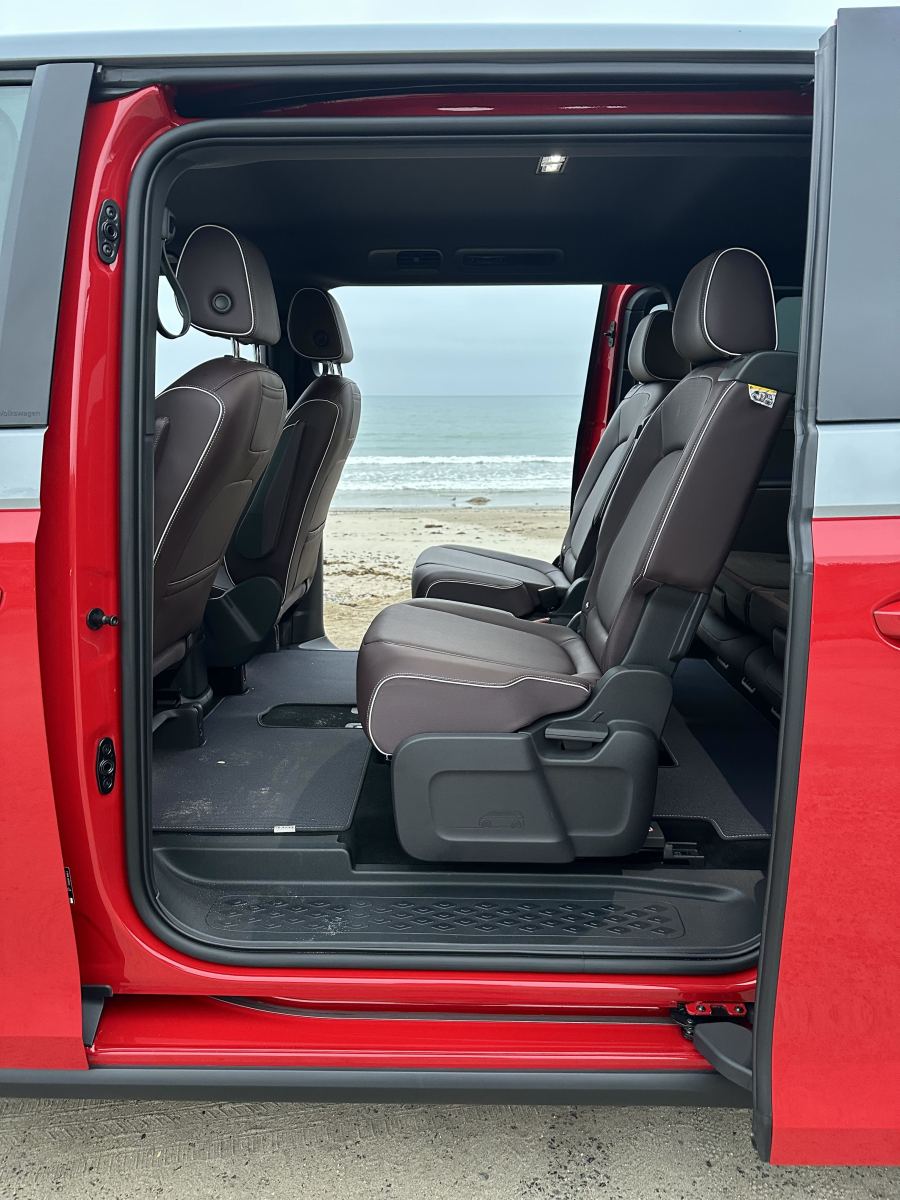 Space is generous for up to seven passengers and their gear. Seven seats, standard on the RWD ID.Buzz, contains a second row with a heated (outbound seats) bench that folds 60:40, reclines 16 degrees, slides 7.9 inches and can be removed. It also moves 4 inches with the flip of a handle to allow for easier access to the third-row seats.