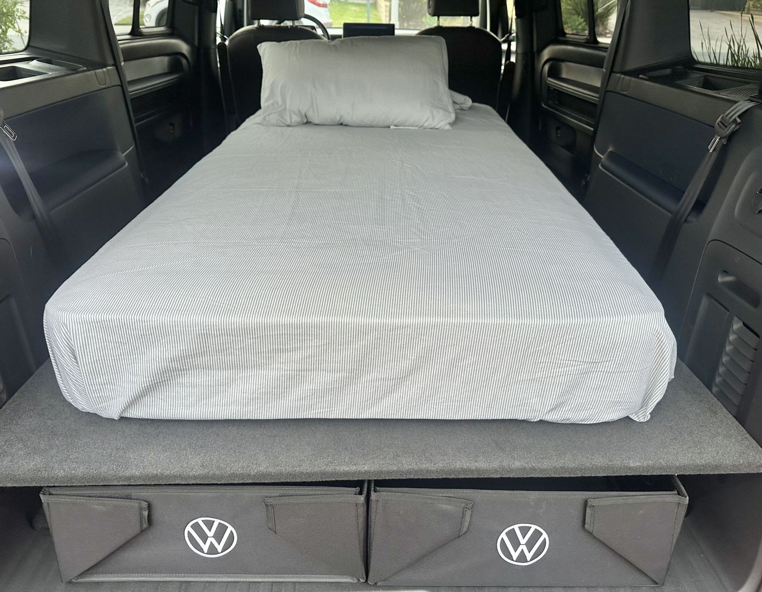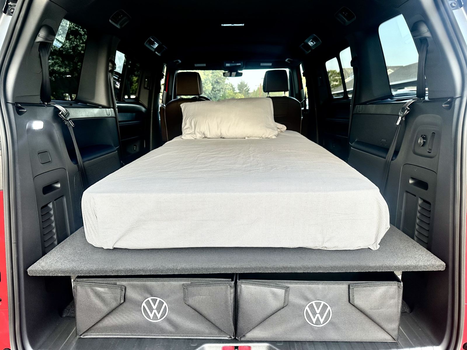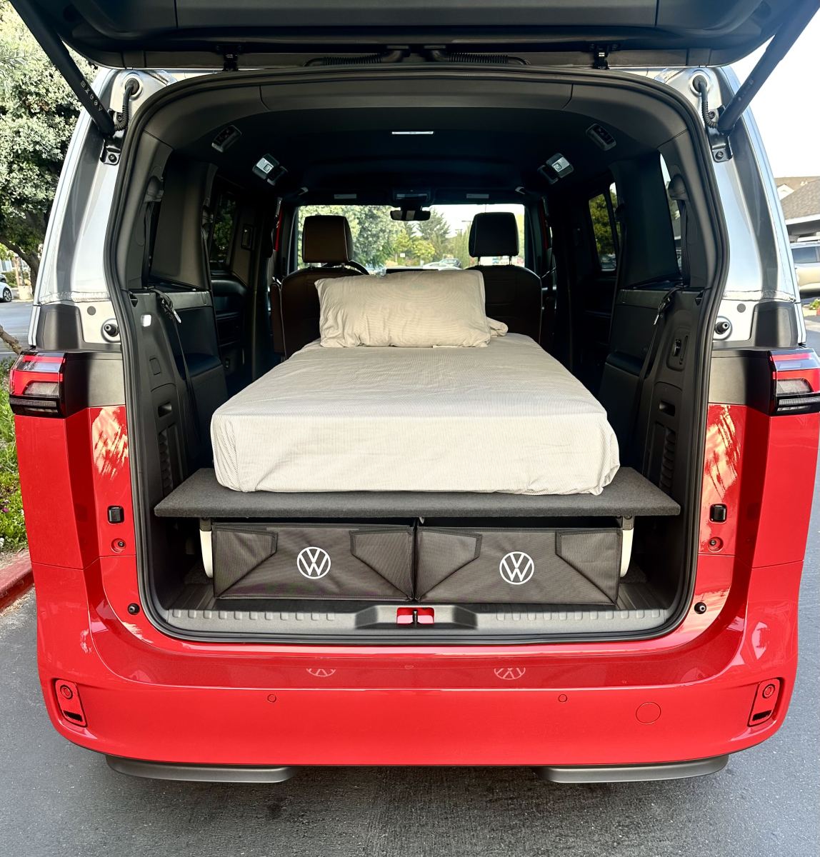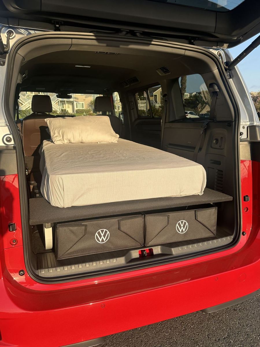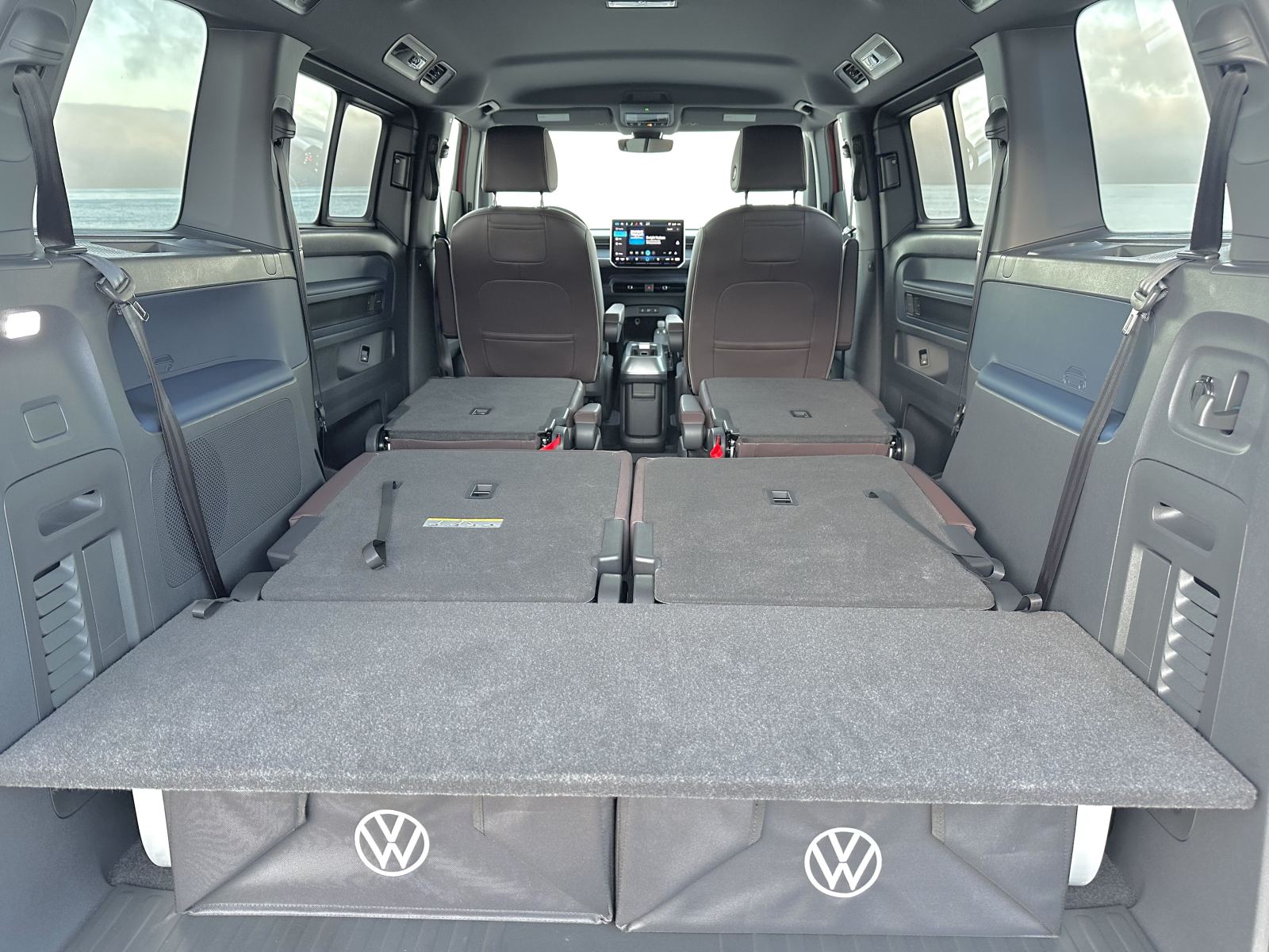 The second and third row seats fold flat and, when the Flexboard is in-place at the far rear, it makes for a wide sleeping area for two adults, two adults and a kid or for two adults and a dog. There are two removable storage bins below, Buzz Boxes, and recessed storage areas. In other words, the 2025 ID.Buzz is ready for around town errands or a camping adventure.