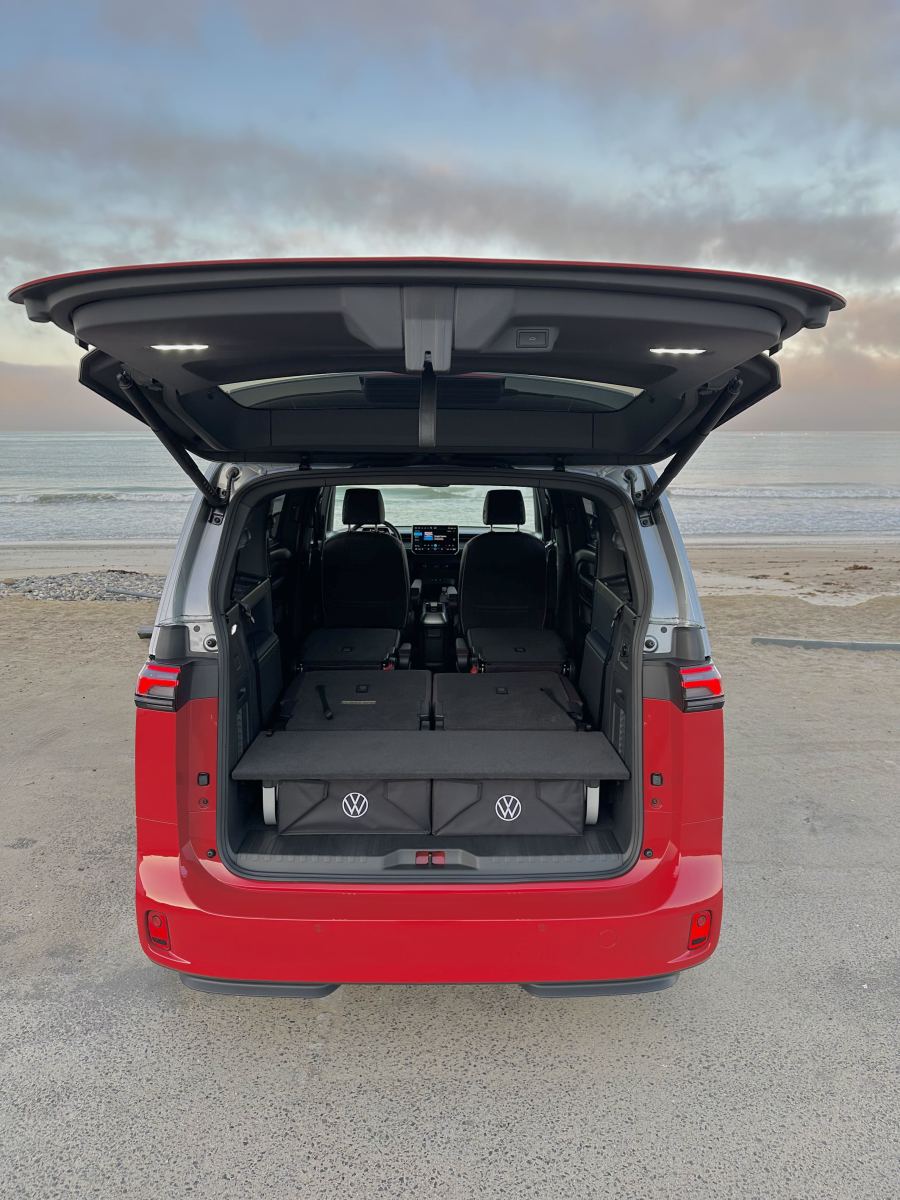 The second and third row seats fold flat and, when the Flexboard is in-place at the far rear, it makes for a wide sleeping area for two adults, two adults and a kid or for two adults and a dog. There are two removable storage bins below, Buzz Boxes, and recessed storage areas. In other words, the 2025 ID.Buzz is ready for around town errands or a camping adventure.