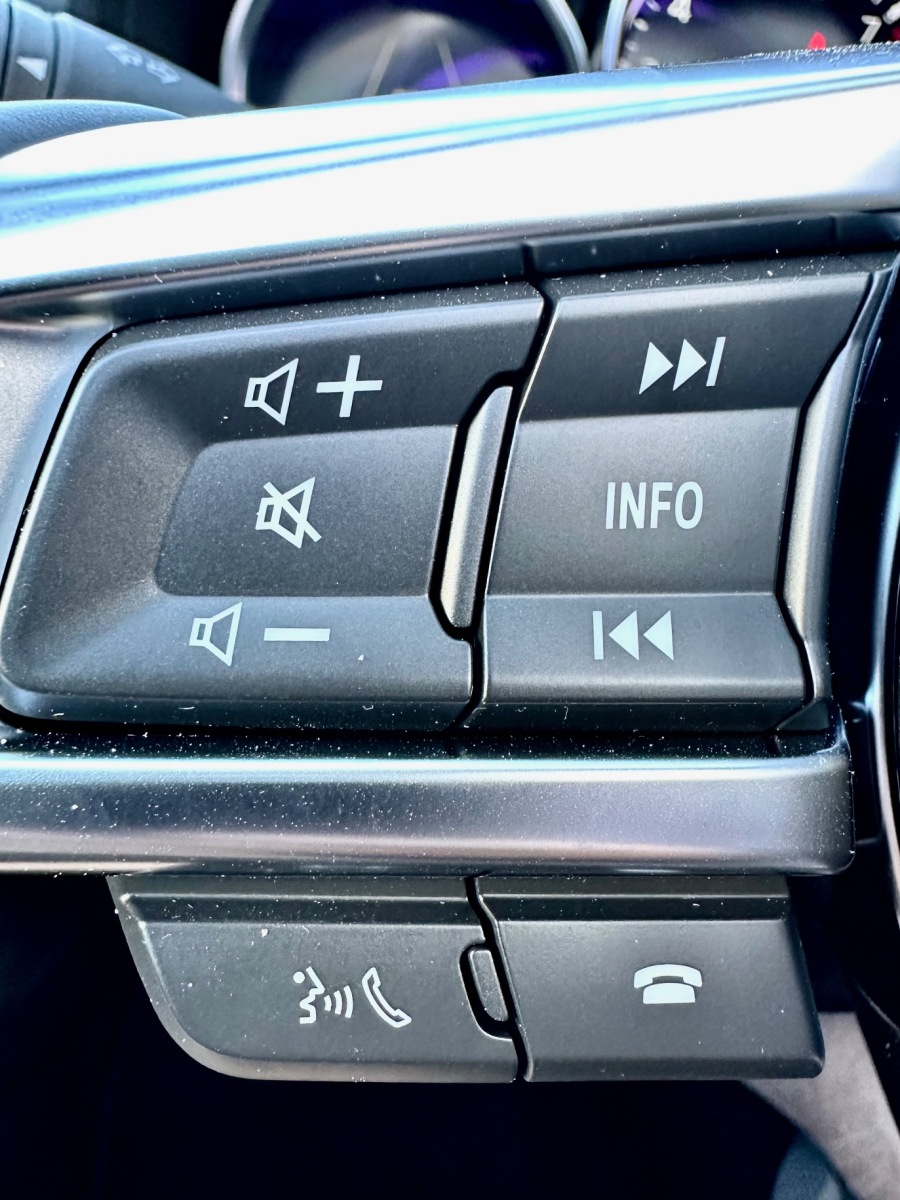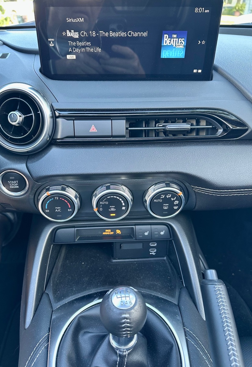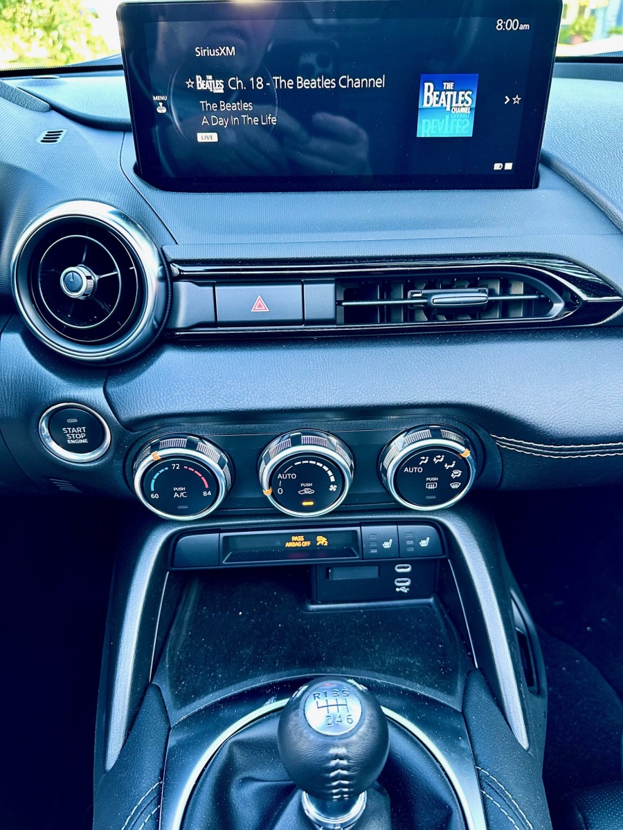 Mazda has worked hard on reducing noise inside the cabin when the top is lowered with technology that adjusts the sound based on background noise. While driving 70 mph on the freeway, I received an incoming call, which I took using the Bluetooth hands-free feature accessed by the steering wheel mounted controls.