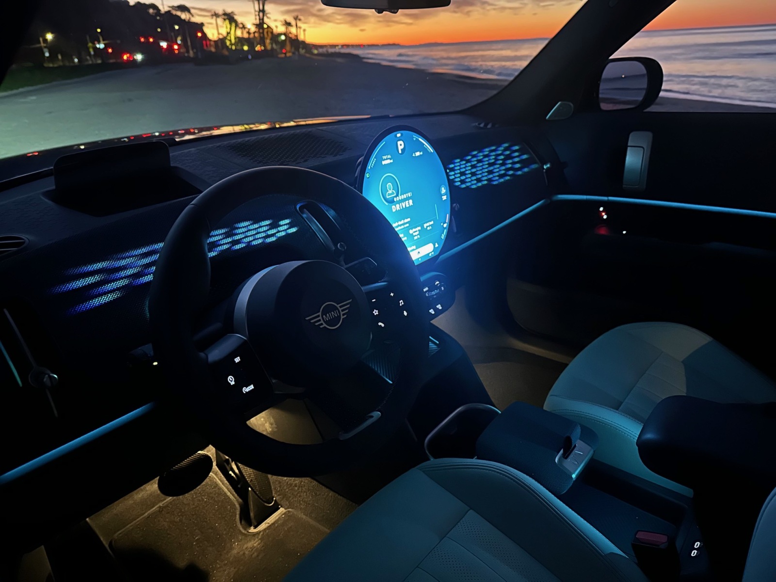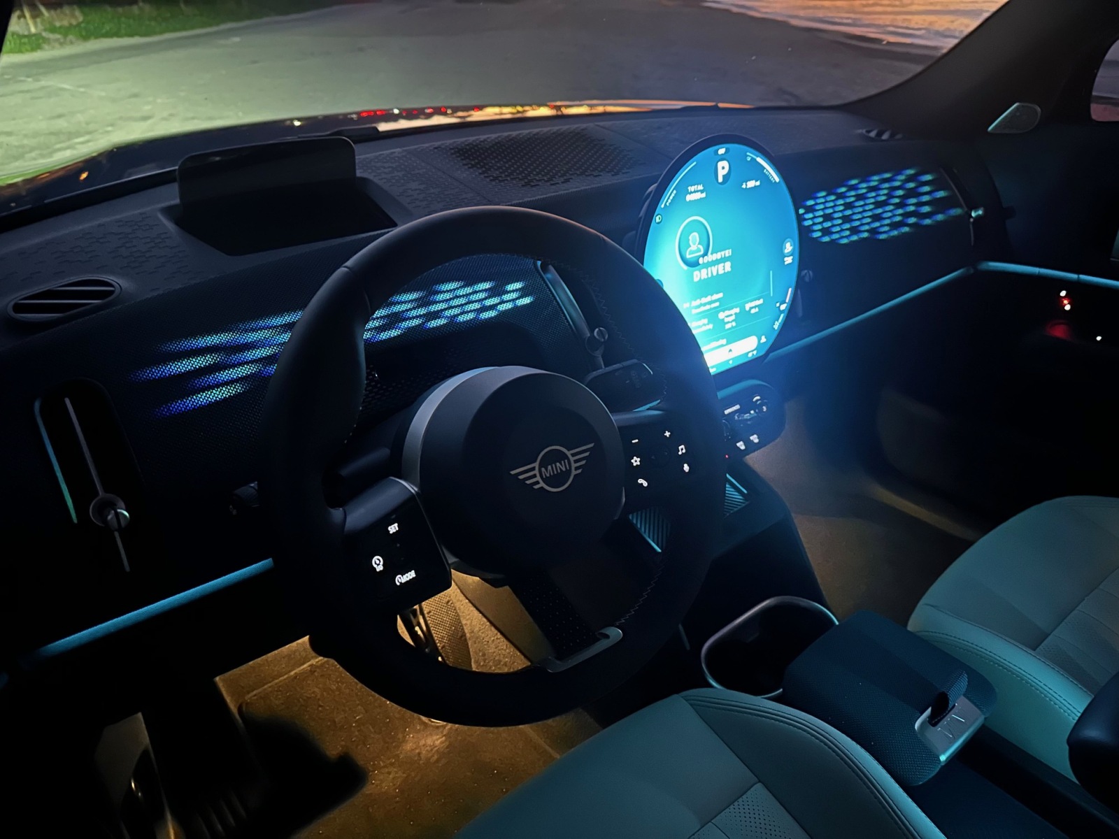 The Mini Countryman SE interior has character with knitted surfaces replacing areas commonly where soft plastic is found. The faded-color door panels and the backlit dash are unique and look great.